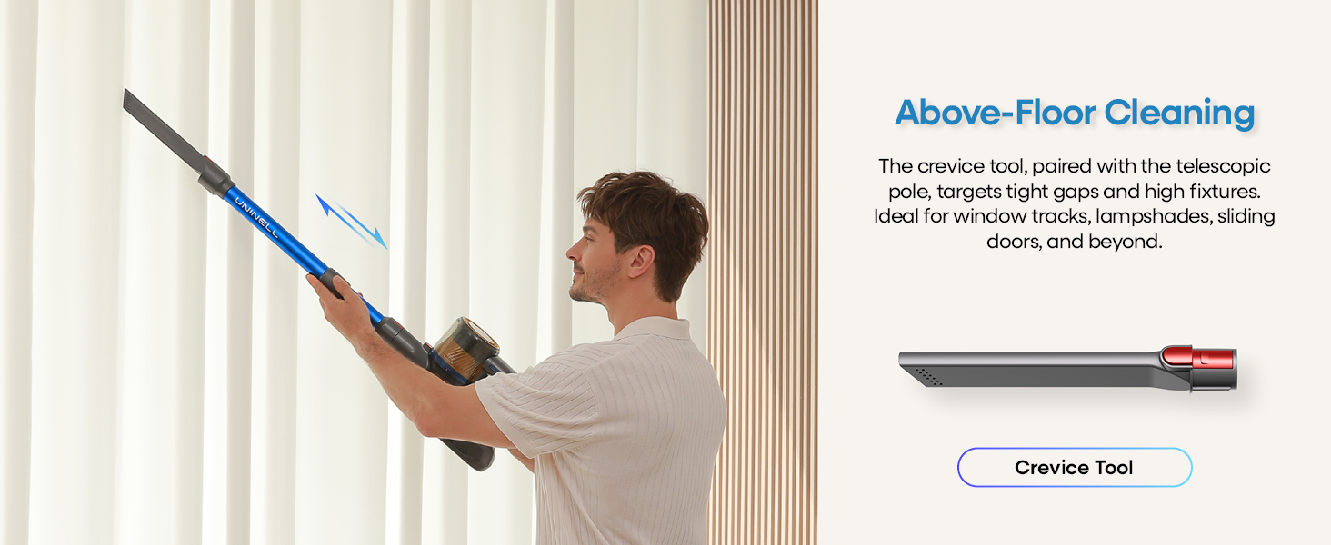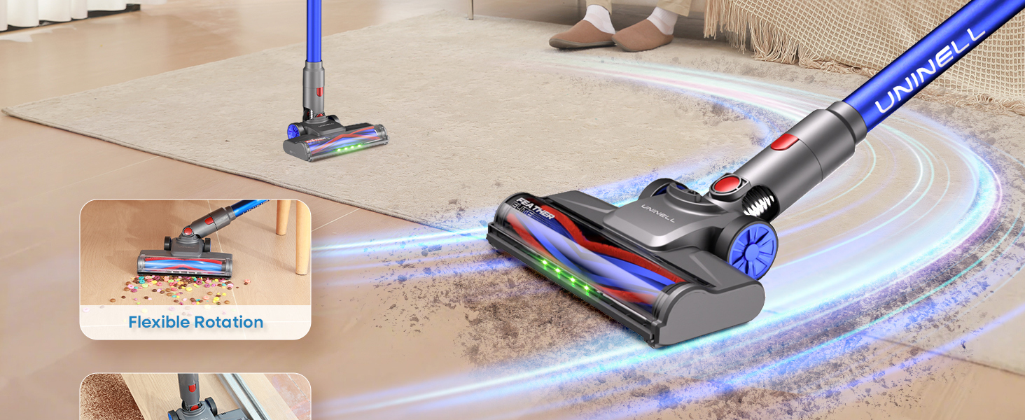【Self-Standing & Ultra-Low Profile Design】The cordless vacuum cleaner stands on its own during pauses—no leaning against walls, ideal when baby wake up. 180° flat design slides under furniture >3.5" high (beds/sofas/cabinets), reaching 35" deep into dark corners, illuminated by 4 LED lights.