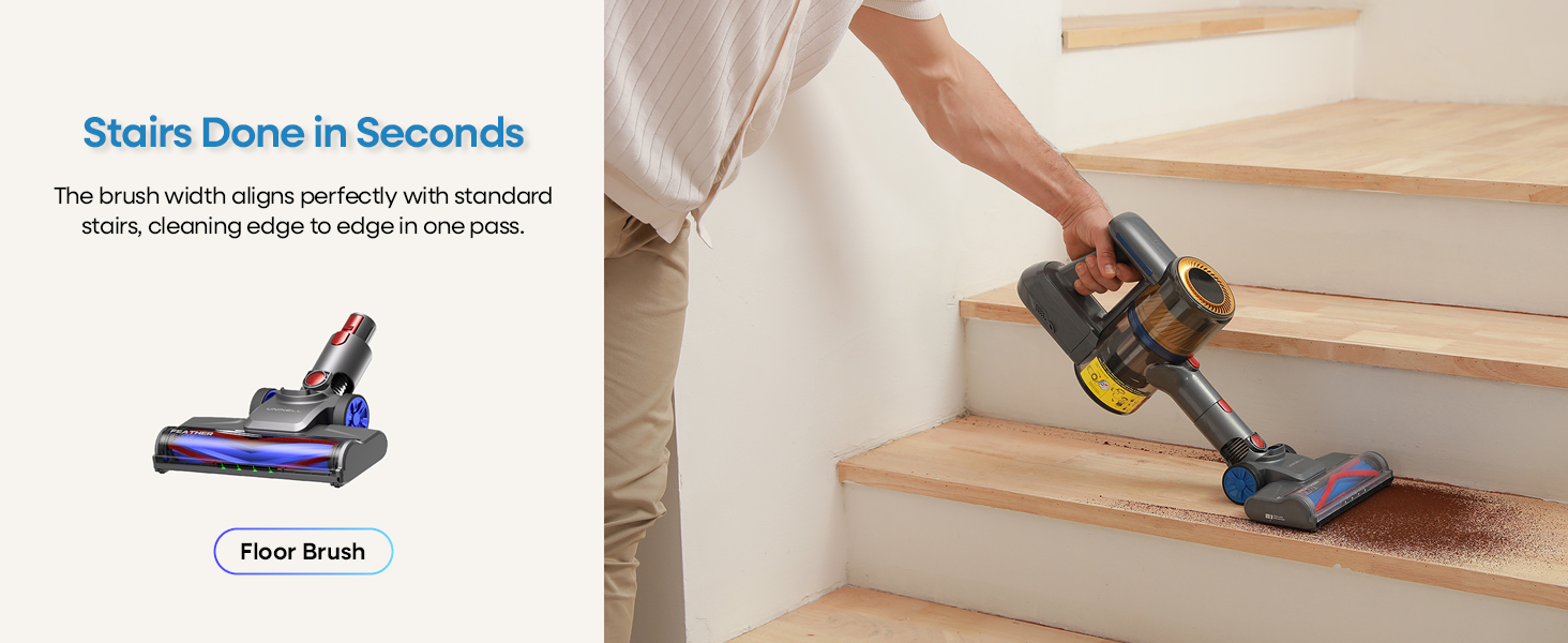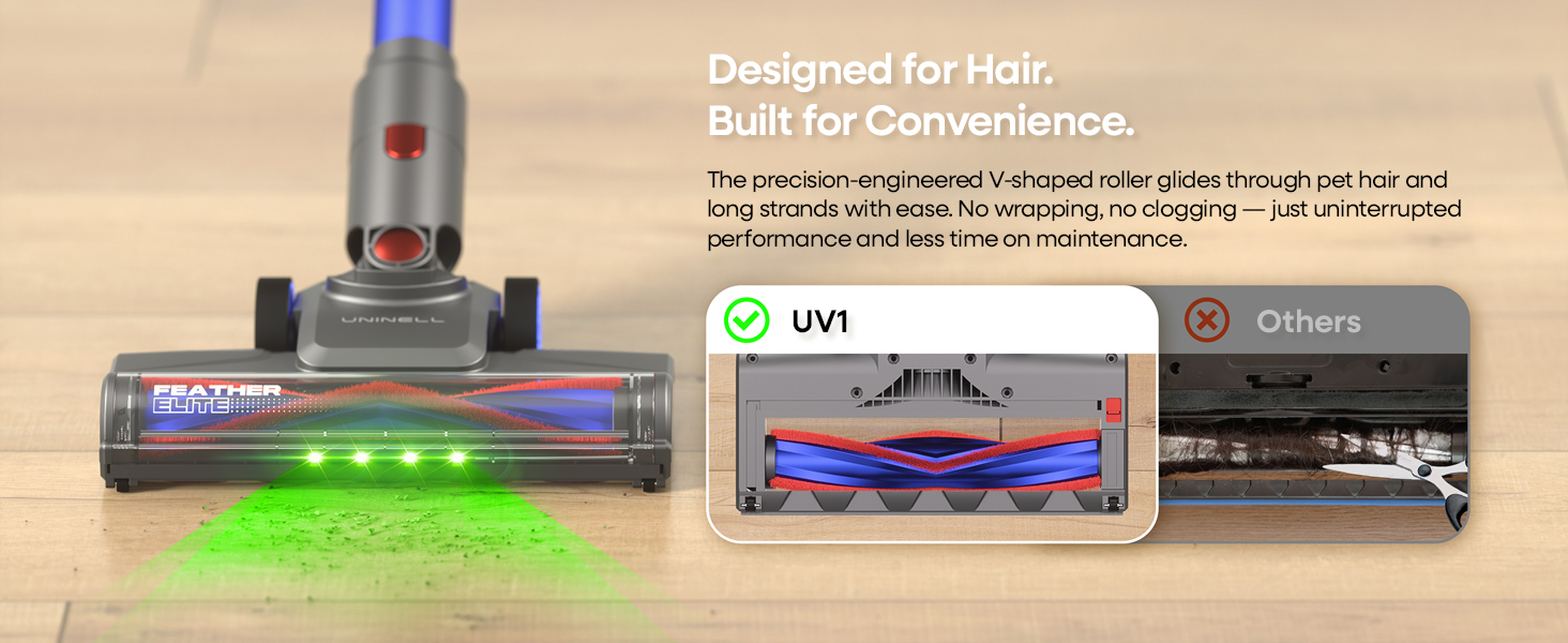 【V-Flair Anti-Tangle System】The stick vacuum for pet hair is specifically engineered to prevent hair wrap. The unique brushroll design ensure pet and human hair is sucked into the 1L dustbin, not tangled on the brush—eliminating tedious manual cleanup.50% less maintenance and scissors retired.